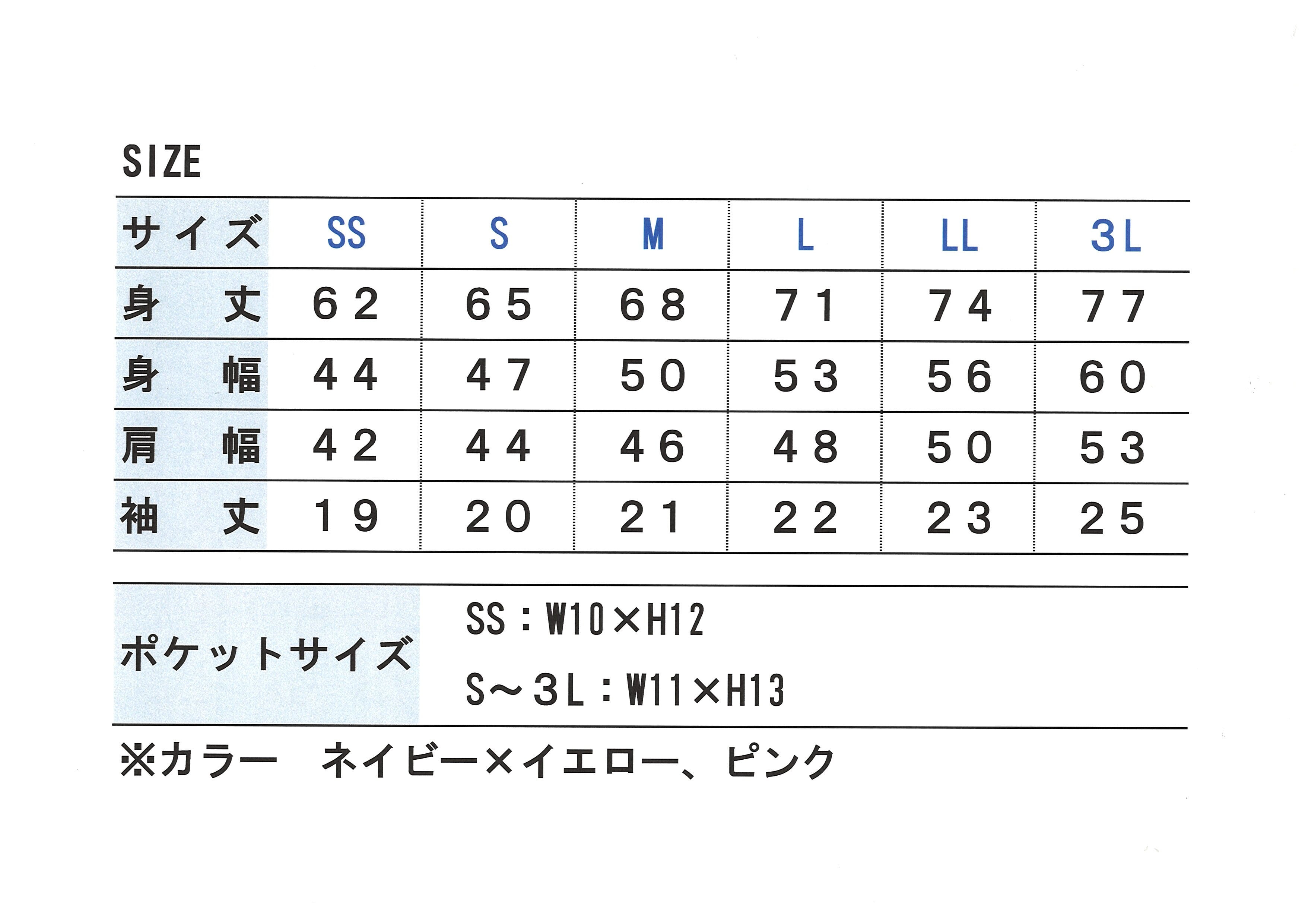 サイズはSS、S、M、L、LLの4サイズ(ネイビー×イエローのみ3Lもご用意しております。)